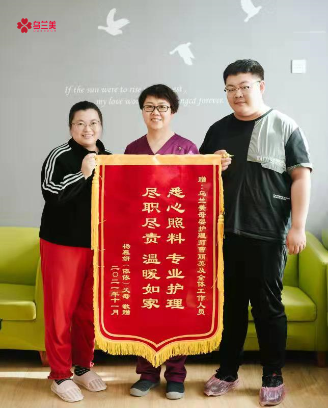 2021年11月即將滿一個(gè)月的月子生活,讓依依寶寶的媽媽難以忘懷,她親身體會(huì)到了烏蘭美醫(yī)養(yǎng)月子中心母嬰護(hù)理師曹麗英無(wú)微不至的關(guān)懷和照顧,感受了每一位工作人員飽滿的工作熱情。在寶寶滿月這天,特地給烏蘭美醫(yī)養(yǎng)月子中心準(zhǔn)備了禮物——一面寫(xiě)著“悉心照料,專業(yè)護(hù)理,盡職盡責(zé),溫暖如家”的感謝錦旗,錦旗充分表達(dá)了寶媽及家屬對(duì)烏蘭美醫(yī)養(yǎng)月子中心所有工作人員及母嬰護(hù)理師曹麗英深切的感激之情。