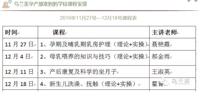 【通知】烏蘭美孕產(chǎn)部準媽媽學校課程通知發(fā)布時間: 2016-11-25 -